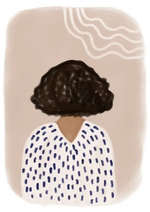 Dit abstracte schilderij toont een poster van een persoon van achteren. Ze heeft zwart krullend haar en draagt een wit overhemd met een blauw patroon. Op de achtergrond bevindt zich een decoratief lijnenpatroon.