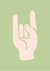 Dit schilderij toont een gestileerde hand die het "rock on"-gebaar maakt, met de wijs- en pink naar boven uitgestrekt, tegen een gedempte groene achtergrond.