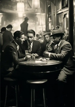 Een schilderij met mannen rondom een tafel in een vintage bar.