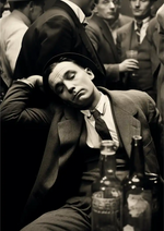 Een schilderij van een man die een paar biertjes teveel op heeft.