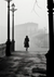 Een zwart-wit schilderij van een dame, met een vervaagde omgeving.