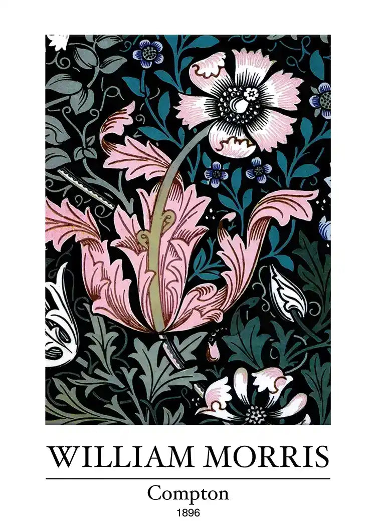 Dit schilderij, genaamd "Compton" en gemaakt door William Morris in 1896, toont een levendige bloemenprint met grote, gestileerde roze en witte bloemen en groen blad op een donkere achtergrond.