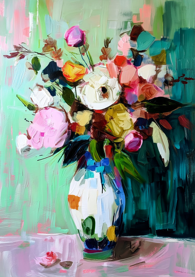Ausdrucksstarke Pinselstriche und leuchtende Farben erwecken einen Blumenstrauß mit purer, malerischer Energie zum Leben.