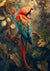 Auf diesem Gemälde sehen Sie einen lebhaften Papagei, der auf einem Ast sitzt, umgeben von üppigem Laub. Mit auffälligen roten, grünen, blauen und gelben Federn und einem Hintergrund aus Blättern und Blumen strahlt es eine tropische Atmosphäre aus.