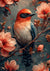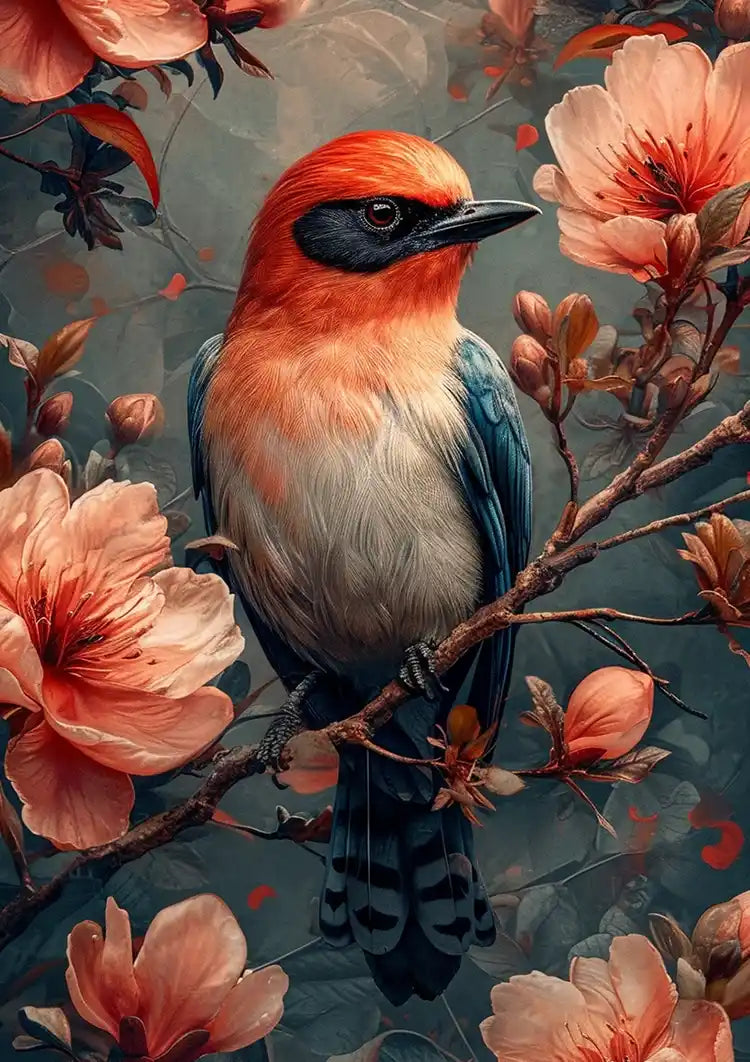Auf diesem Gemälde sehen Sie einen farbenfrohen Vogel auf einem Ast, umgeben von rosa Blumen. Mit seinem rot-orangefarbenen Kopf, blauen Flügeln und weichem weißem Bauch sowie dem lebendigen Hintergrund aus zusätzlichen Blättern und Blumen entsteht eine lebendige Szenerie.