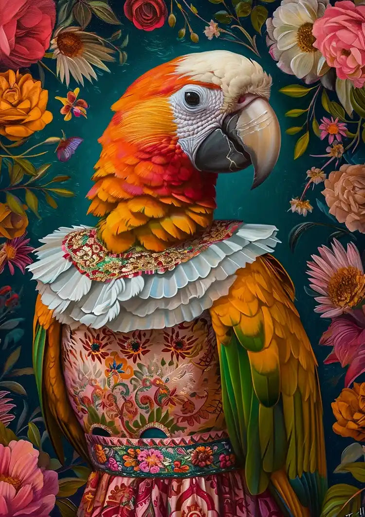 Auf diesem Gemälde prangt ein lebhafter Papagei, gehüllt in ein detailliertes, farbenfrohes Outfit, umgeben von komplizierten Blumen. Mit warmen Tönen wie Orange, Gelb und Grün, und seine Kleidung ist mit aufwendigen Mustern und einem Rüschenkragen verziert.