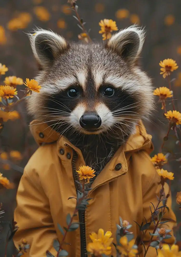 Auf diesem Gemälde ist ein Waschbär in einer gelben Jacke zu sehen, der mitten in gelben Blumen steht und mit einem neutralen Blick direkt in die Kamera schaut. Der leicht verschwommene Hintergrund sorgt dafür, dass der Waschbär und die Blumen schön hervorgehoben werden.