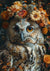 Auf diesem Gemälde ist eine Eule mit großen, intensiven Augen zu sehen, geschmückt mit einem Blumenkranz aus gelben, orangefarbenen und pfirsichfarbenen Blumen. Der Hintergrund ist mit weiteren Blumen und dunklem Grün gefüllt, während die braun-weißen Federn der Eule deutlich sichtbar sind.