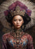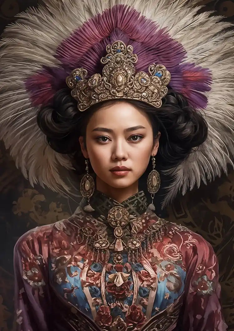 Dieses Gemälde zeigt eine Person mit einem eleganten Kopfschmuck mit großen Federn und komplizierten Schmuckstücken, gekleidet in ein üppig verziertes Kleidungsstück mit detaillierten Mustern und Accessoires, was einen königlichen und traditionellen Eindruck vermittelt.