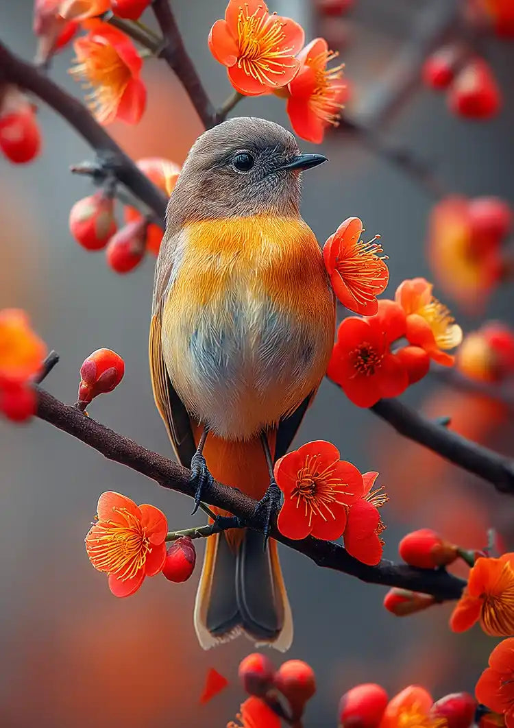 Auf diesem Gemälde sieht man einen kleinen Vogel mit orangefarbenen und braunen Federn, der auf einem Ast eines blühenden Baumes mit lebhaften roten Blüten und Knospen sitzt. Der sanfte, verschwommene Hintergrund hebt den Vogel und die Blumen hervor und erzeugt einen farbenfrohen Kontrast.