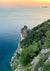 Dieses Gemälde zeigt eine Klippenwand, die dicht mit Grün bedeckt ist und zu einem ruhigen blauen Meer führt.