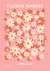 Ein Gemälde, das einen "Blumenmarkt" in London ankündigt, Pastell-Edition für Juli 2021, mit einem Muster aus weißen und pfirsichfarbenen Blumen vor einem zartrosa Hintergrund.