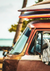 Auf dem Gemälde sieht man einen Teil eines Kleinbusses mit mehreren Surfbrettern auf dem Dach.