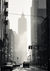 Eine Schwarz-Weiß-Fotografie mit Nebel, mit Blick auf einen großen Turm.