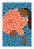 Dieses Gemälde zeigt eine Frau mit brauner Haut und langem dunklem Haar, gekleidet in ein rotes Kleid mit rosa Punkten, die sich in einer dynamischen Haltung nach vorne beugt, vor einem blauen Hintergrund mit schwarzen Punkten.