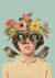 Dit Gemälde zeigt eine Person mit bunten Blumen und Vögeln auf ihren Schultern, die ein beiges Hemd mit hohem Kragen vor einem hellblauen Hintergrund trägt.