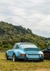Ein babyblauer Porsche 911, geparkt auf einer Wiese mit sanften Hügeln im Hintergrund an einem bewölkten Tag. Das Auto wurde von hinten fotografiert.