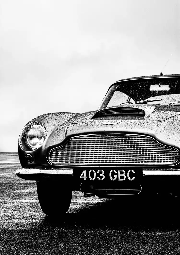 Dieses Gemälde zeigt ein Schwarzweißfoto eines wunderschönen Aston Martin, nass vom Regen, geparkt an einem grauen, bewölkten Tag. Der Fokus liegt auf der rechten Vorderseite des Autos, was das schlanke Design betont.