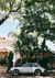 Dieses Gemälde zeigt einen klassischen silbernen Porsche 911, der im Schatten üppig grüner Bäume vor einem zweistöckigen Haus geparkt ist, mit einem sonnigen, klaren Himmel darüber.