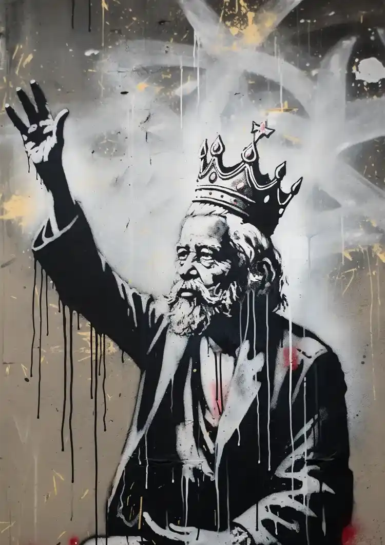 Dieses Gemälde zeigt Straßenkunst mit einem älteren Mann mit Bart und Krone, der den Arm hebt.