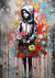 Dieses Gemälde zeigt ein Graffiti-Kunstwerk eines Kindes in einem Kapuzenpullover, das bunte Blumen hält.