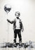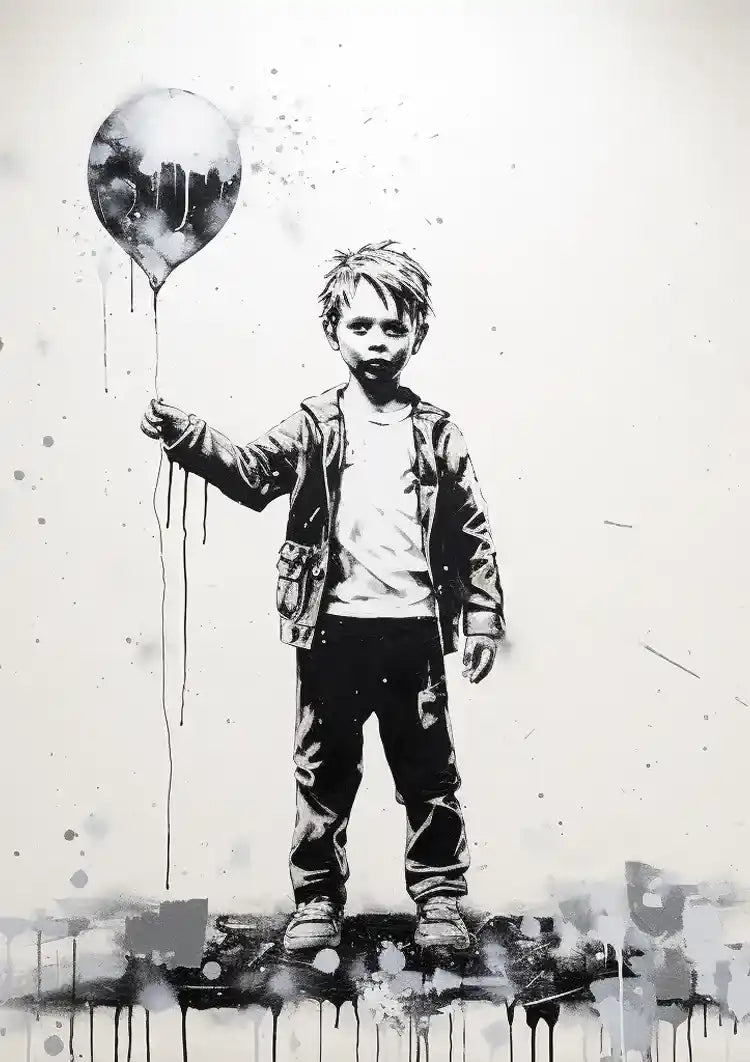 Ein schwarz-weißes Gemälde eines Jungen, der mit einem Ballon steht.