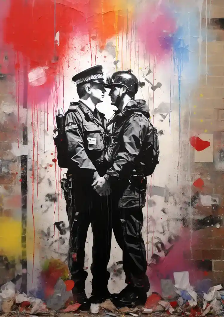 Dieses Gemälde zeigt zwei sich küssende britische Polizisten vor einem lebhaft farbigen Hintergrund mit roten Spritzern und schwarz-weißen Streifen.