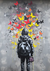 Dieses Gemälde zeigt eine Person von hinten, die einen Rucksack trägt und nach oben auf eine Explosion bunter Schmetterlinge in den Farben Rot, Orange, Gelb und Rosa blickt.