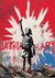 Dieses Gemälde zeigt Straßenkunst mit einer Schablone eines Kindes, das nach oben greift, vor einem strahlend roten Hintergrund.