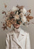 Dieses Gemälde zeigt das Gesicht einer Person in einem cremefarbenen Mantel und Rollkragenpullover, teilweise verborgen durch ein großes Blumenarrangement mit Blumen und Blättern in Weiß, Beige und Braun vor einem neutralen Hintergrund.