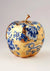 Dieses Gemälde zeigt ein dekoratives Objekt eines großen, goldenen Apfels, verziert mit komplizierten blauen Blumenmustern und einem Drachenmotiv.