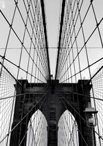 Ein Schwarz-Weiß-Gemälde der Brooklyn Bridge mit den vielen Kabeln und einem der gotischen Türme, gesehen vom Fußgängerweg aus.