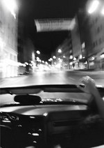 Ein Gemälde mit einer bewegten Aussicht, aufgenommen aus einem fahrenden Auto mit offenem Dach.