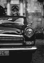 Dieses Gemälde zeigt ein Schwarzweißfoto eines Oldtimers, der neben einem alten Steingebäude geparkt ist, mit einem glänzenden Kühlergrill und runden Scheinwerfern des Autos.