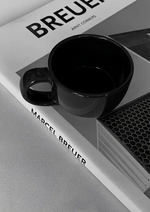 Ein Schwarz-Weiß-Gemälde mit einer Kaffeetasse, die auf einem Buch mit dem Titel "Marcel Breuer" steht.