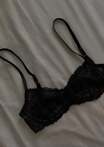 Ein Gemälde mit einer schwarzen Spitzen-BH als Hauptmotiv auf einem weißen Laken.
