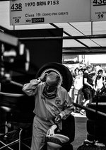 Dieses Gemälde zeigt einen älteren Mann in einem Rennanzug, der seinen Helm bei einem Formel-1-Auto in einem belebten Fahrerlager abgenommen hat, mit Reifen und Zuschauern im Hintergrund sichtbar.