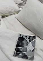 Schwarz-weißes Gemälde eines Bettes mit zerknitterten weißen Laken und Kissen, auf denen eine Vogue-Zeitschrift liegt.