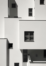 Schwarz-weißes Gemälde mit Blick auf die weißen Fassaden eines modernen Gebäudes mit schwarzen Fensterrahmen.