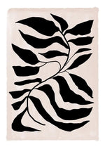 Eine schwarz-weiße Illustration eines grafisch gezeichneten Blattes mit länglichen, welligen Blättern vor einem hellrosa Hintergrund.