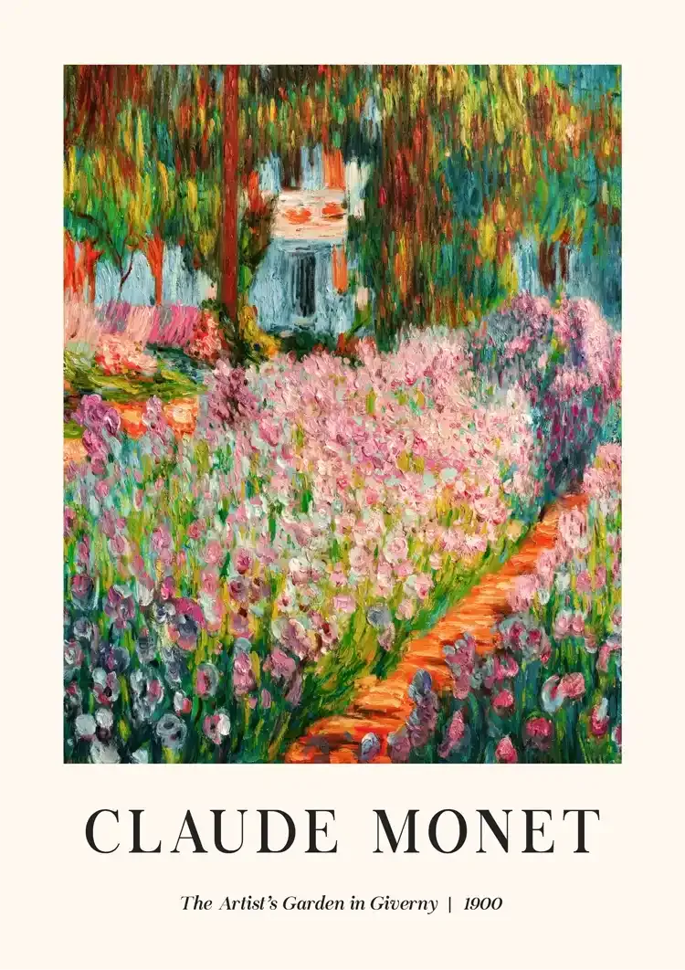 Dieses Gemälde zeigt eine Reproduktion des Gemäldes von Claude Monet mit dem Titel "Der Garten des Künstlers in Giverny" aus dem Jahr 1900. Das Kunstwerk zeigt einen üppigen, lebendigen Garten voller verschiedener bunter Blumen, einen Weg und Grünflächen, mit einem teilweise sichtbaren Gebäude im Hintergrund.