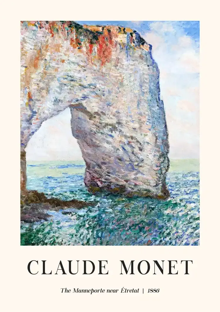 In diesem Gemälde von Claude Monet, "The Manneporte near Étretat" aus dem Jahr 1886, sieht man einen imposanten natürlichen Felsbogen am Meer, der von Wellen getroffen wird, alles in Monets charakteristischem impressionistischem Stil.
