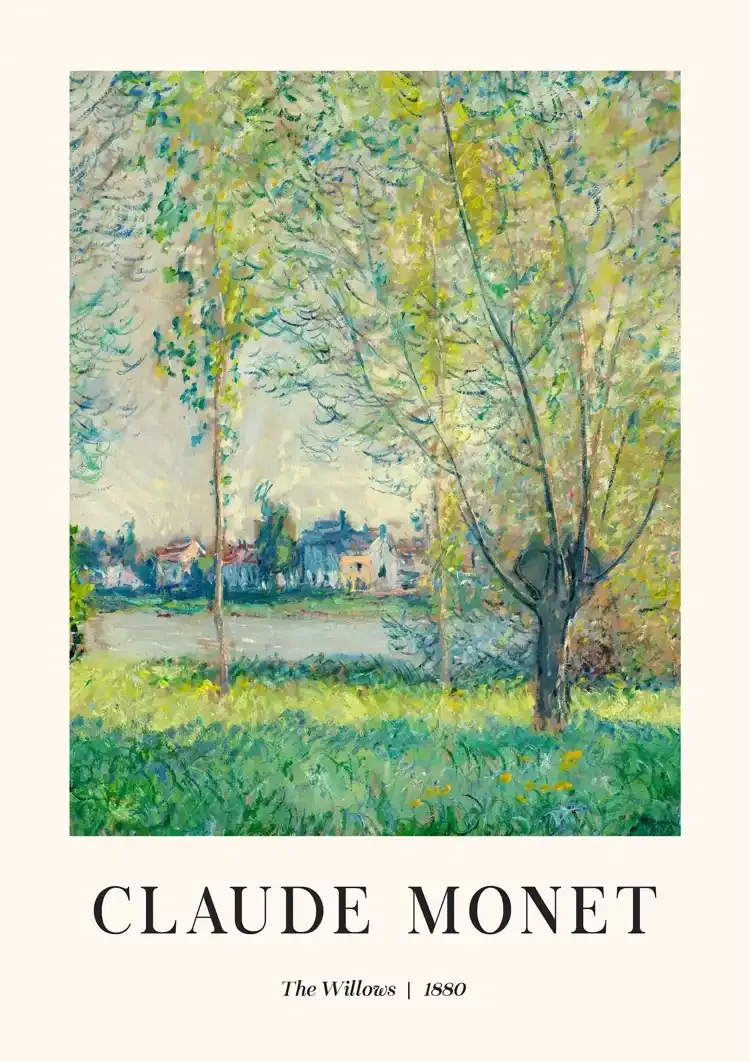 Dieses Gemälde von Claude Monet, "Die Weiden" aus dem Jahr 1880, fängt eine üppige Landschaft mit üppigen Bäumen und einem friedlichen Dorf im Hintergrund ein. Die Farben sind sanft und impressionistisch, charakteristisch für Monets Stil.