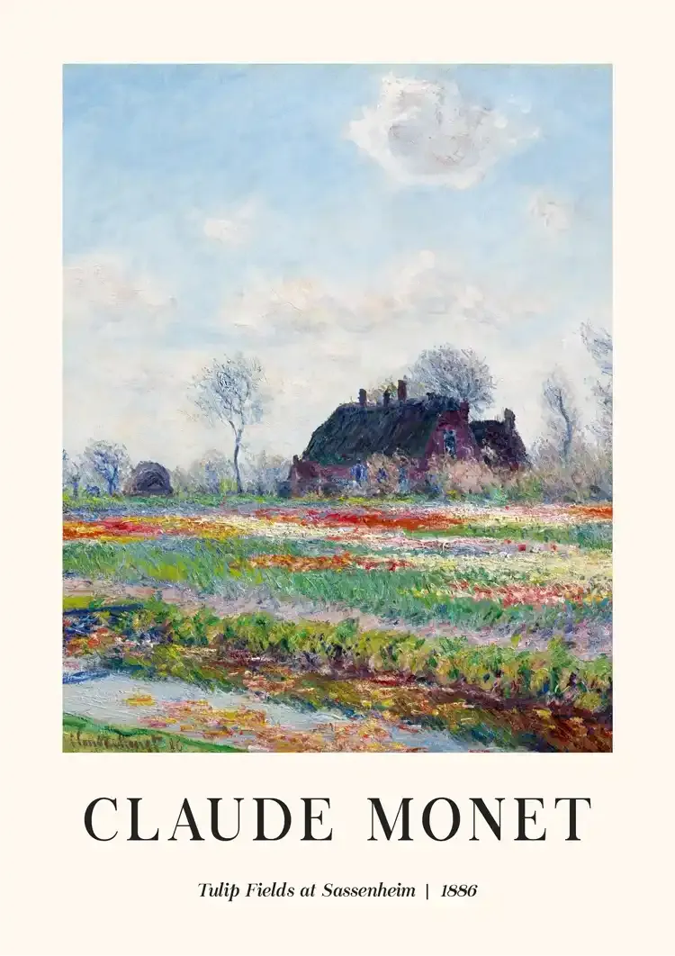 Dieses Gemälde von Claude Monet mit dem Titel "Tulpenfelder bei Sassenheim" erweckt bunte Tulpenfelder zum Leben, mit einem charmanten Häuschen und schlanken Bäumen im Hintergrund, alles unter einem malerischen, teilweise bewölkten Himmel.