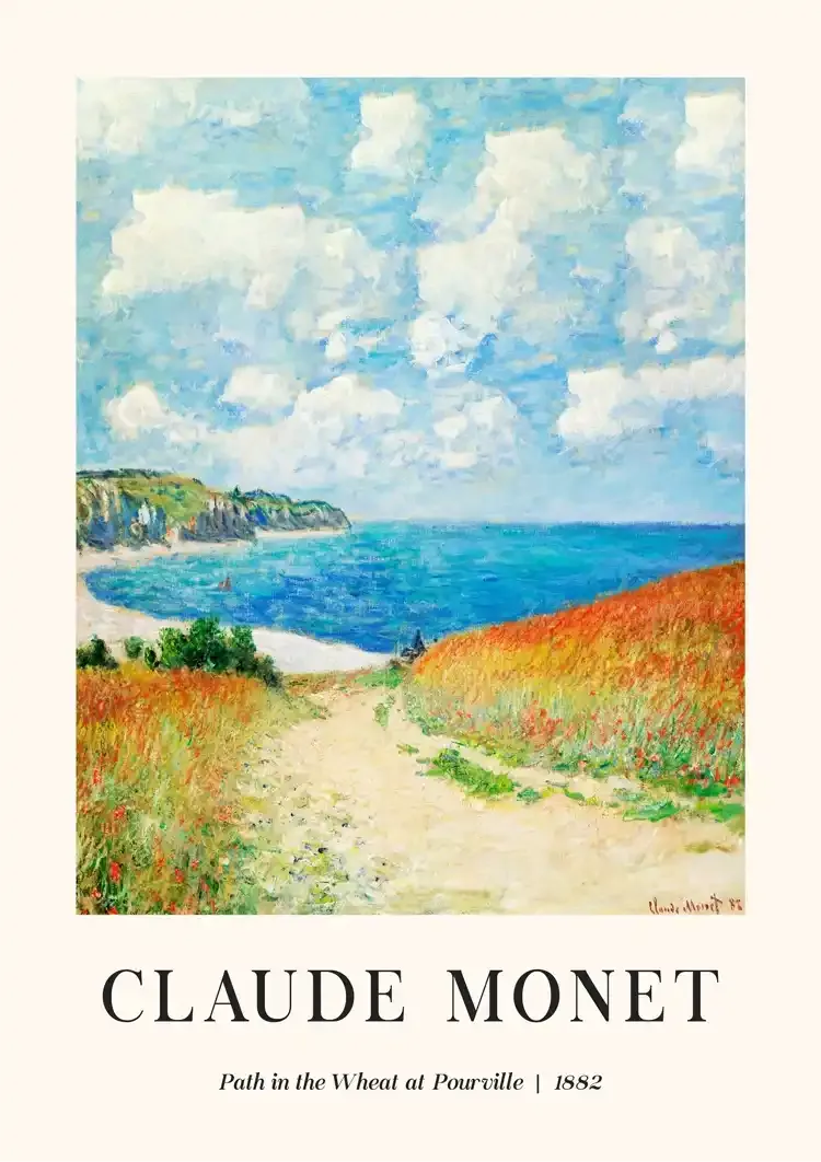 Dieses Gemälde, "Pfad im Weizen bei Pourville" von Claude Monet aus dem Jahr 1882, zeigt eine bezaubernde Szene mit einem unbefestigten Weg durch Weizenfelder und Wildblumen in Richtung Meer, unter einem teilweise bewölkten Himmel.