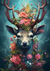 Ein buntes Gemälde eines Hirsches mit einer ausführlichen Darstellung von farbenfrohen Blumen und Früchten, die im großen Geweih verwoben sind, vor einem lebendigen blauen Hintergrund.