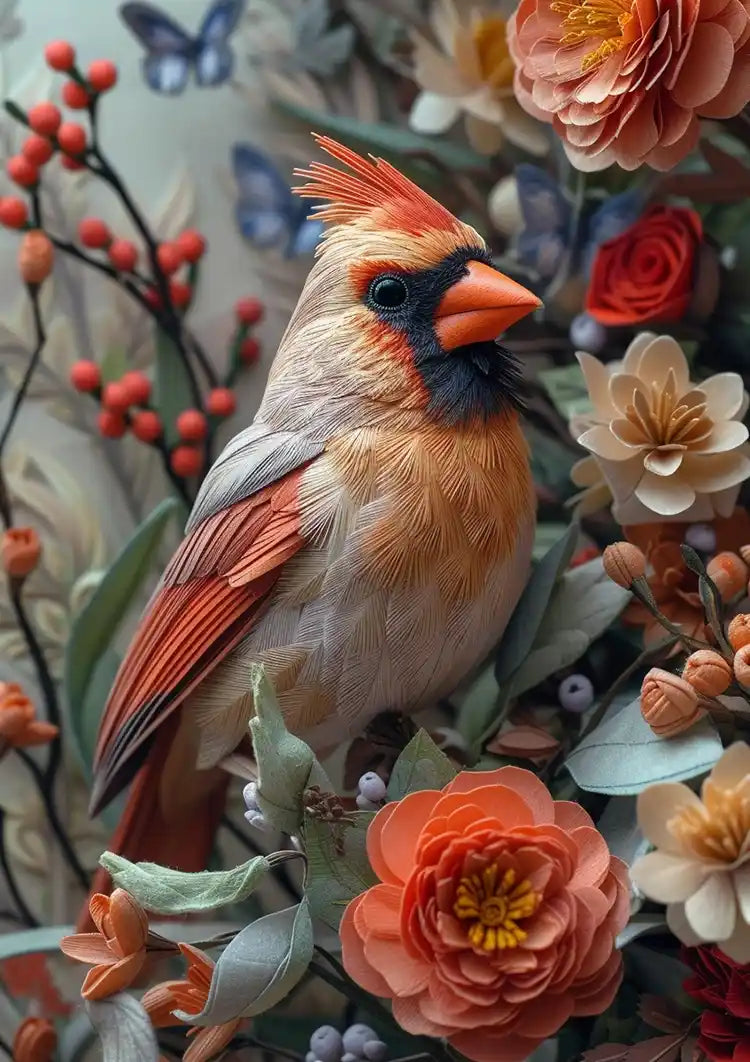 Auf diesem Gemälde sehen Sie eine detaillierte Skulptur eines farbenfrohen Kardinalvogels, umgeben von lebendigen Blumen und Blättern. Mit einem leuchtend orangefarbenen Schnabel und wunderschönem Gefiederdesign sowie Schmetterlingen und Beeren im Hintergrund.