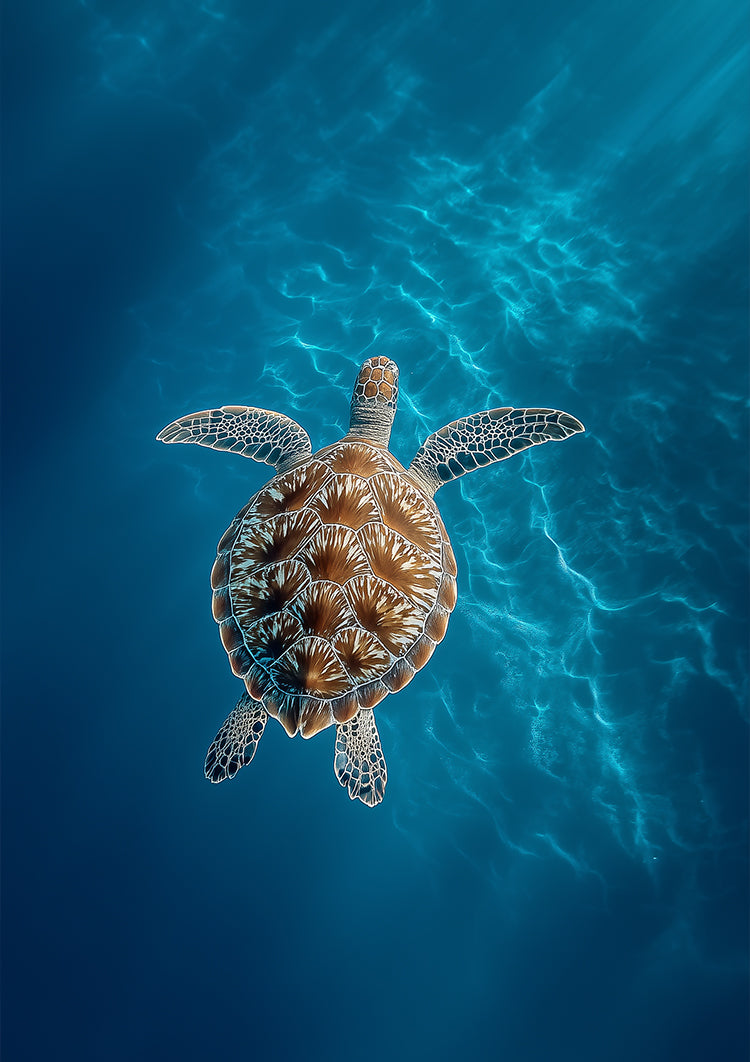 Eine Meeresschildkröte schwebt anmutig durch das klare blaue Wasser, beleuchtet von Sonnenstrahlen von oben.