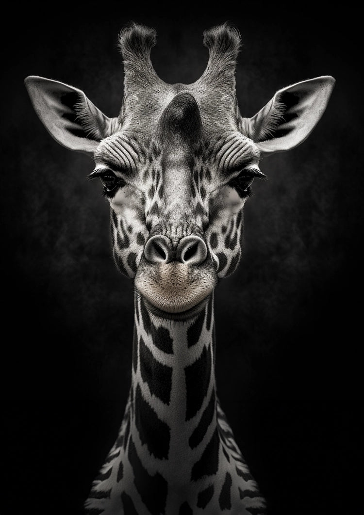 Dieses Gemälde zeigt ein schwarz-weißes Nahaufnahme-Porträt einer Giraffe, die direkt in die Kamera blickt vor einem dunklen Hintergrund. Das Bild fängt wunderschön die charakteristischen Flecken, den langen Hals und die ausdrucksvollen Augen ein.
