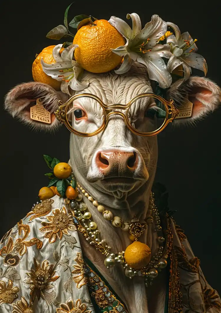 In diesem charmanten Gemälde schmückt eine Kuh mit einer goldgerahmten Brille, einem Gewand mit Blumenmuster und fruchtigen Halsketten. Ihre Kopfbedeckungen prangen mit Orangen und weißen Blumen.